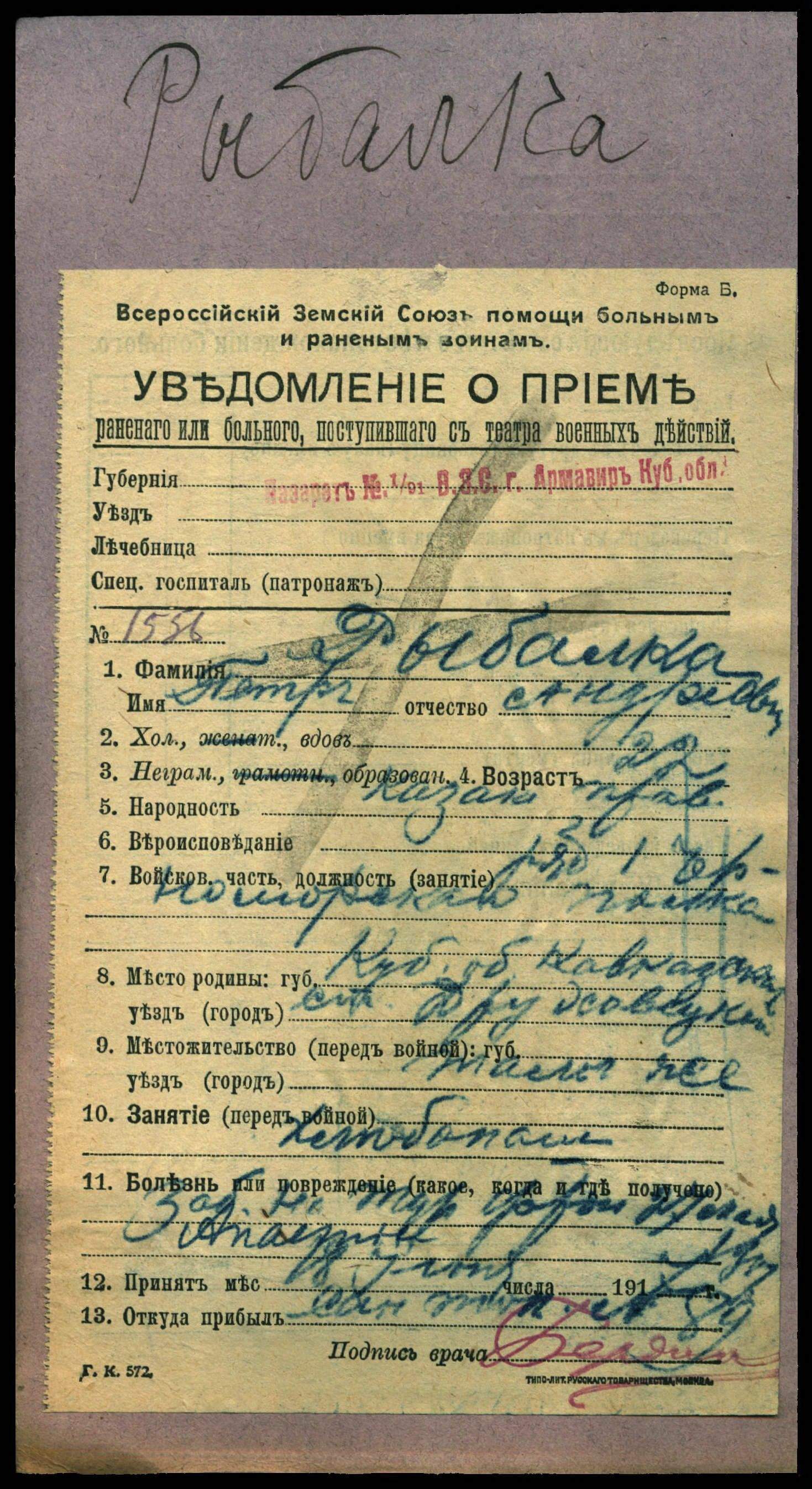 Должность/Звание приказный; конвойный Воинская часть Штаб 9-го Армейского корпуса Место рождения Кубанская обл., Кавказский отдел, стнц. Брюховецкая Причина выбытия болен Дата события 21.06.1916 Тип документа Уведомление о приеме раненого