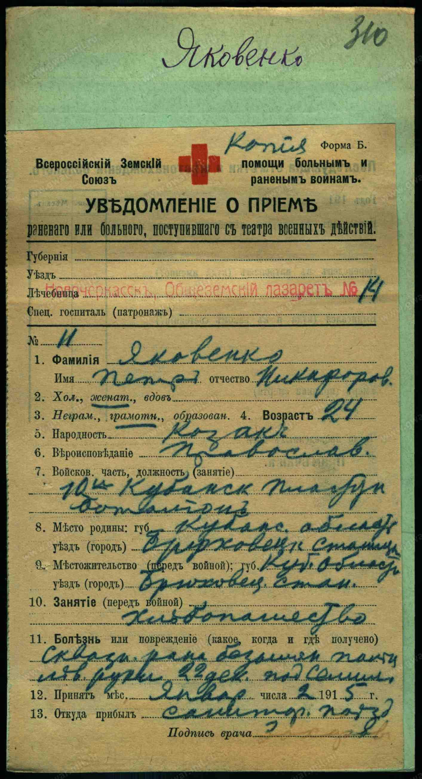 Должность/Звание рядовой Воинская часть Нестроевая рота 16-й Кубанский пластунский батальон Место рождения Кубанская обл., Кавказский отдел, стнц. Брюховецкая Причина выбытия болен Дата события 15.09.1917 Тип документа Уведомление о приеме раненого