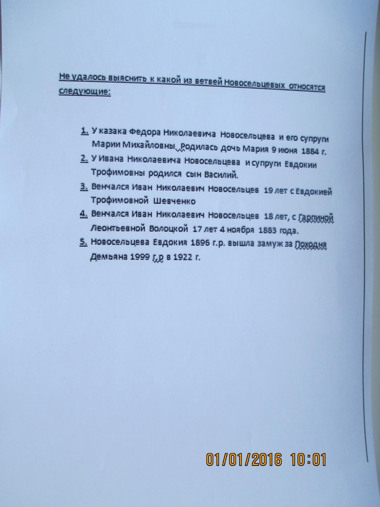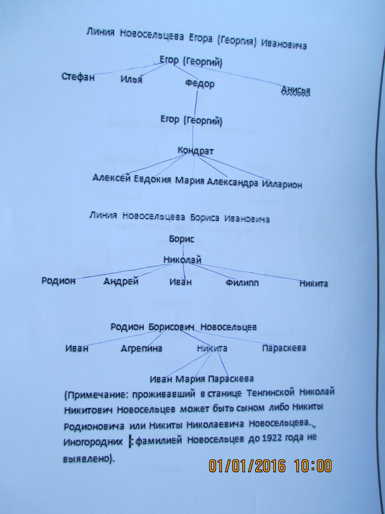 7. Как видно из исследований Новосельцовы были беломестными казаками (станица Новомарьеская была создана ими), откуда прибыли не известно. Дьяченковы, впоследствии буква "в" в фамилии отпала, были Хоперскими казаками.