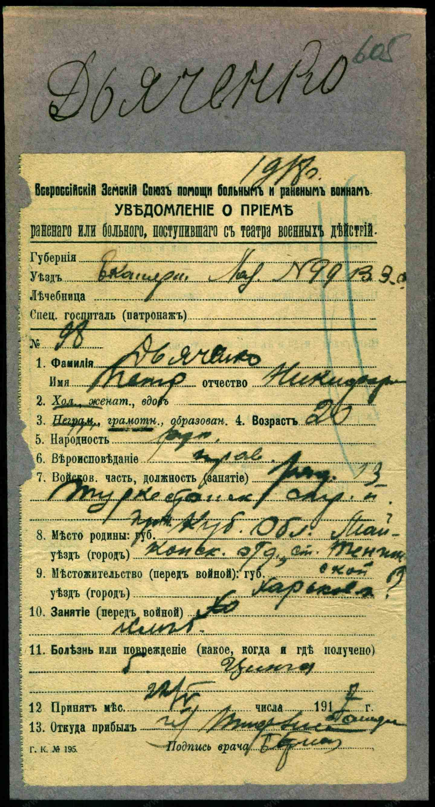 Должность/Звание рядовой Воинская часть 13-й Туркестанский стрелковый полк Место рождения Кубанская обл., Майкопский отдел, ст. Тенгинская Причина выбытия болен Дата события 22.05.1917 Тип документа Уведомление о приеме раненого