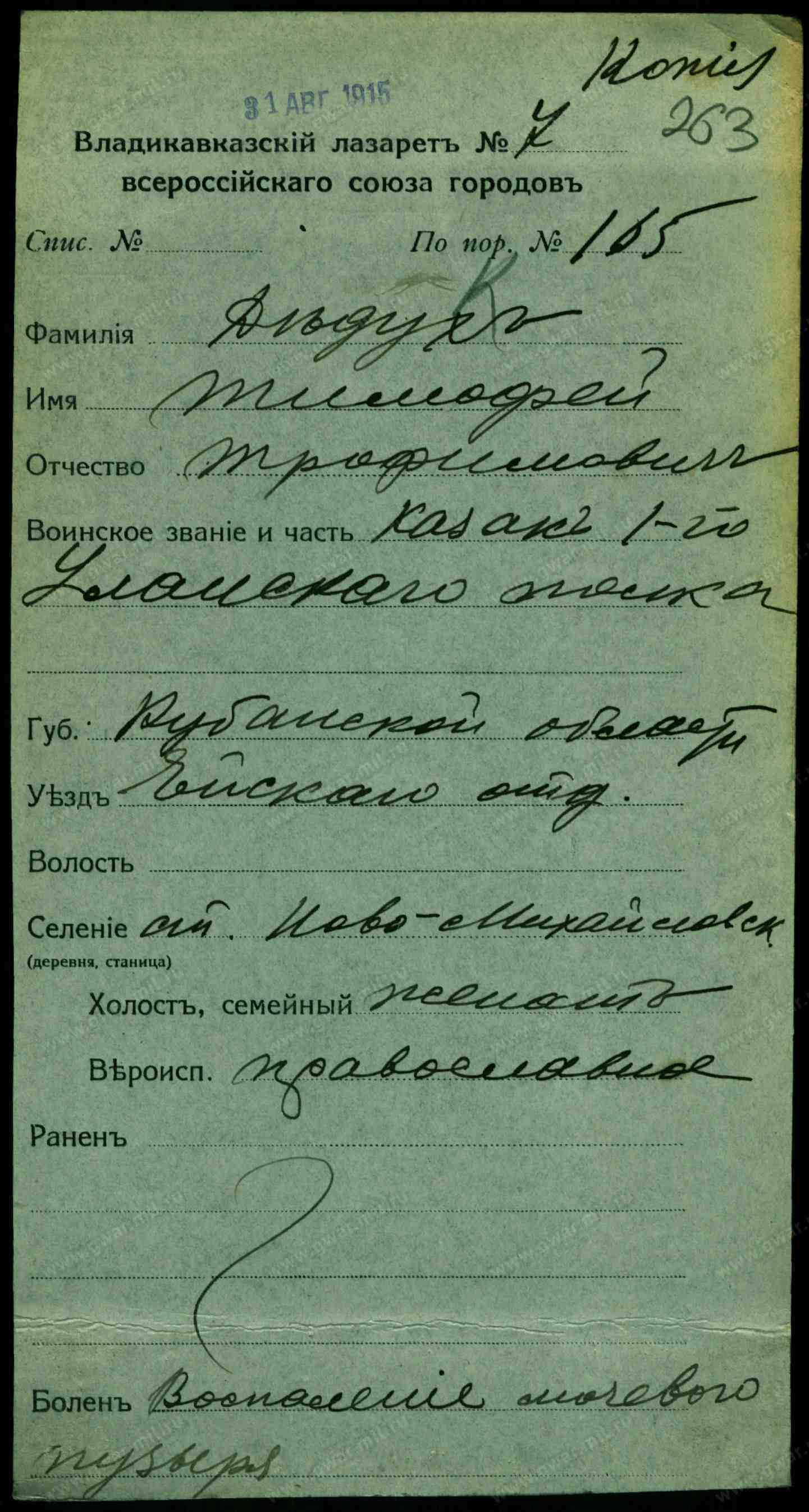Должность/Звание казак Воинская часть 1-й уланский Петроградский (Санкт-Петербургский) полк Место рождения Кубанская обл., Ейский отдел, ст. Ново-Михайловская Причина выбытия болен Тип документа Карточка на прибывших (высшие чины)