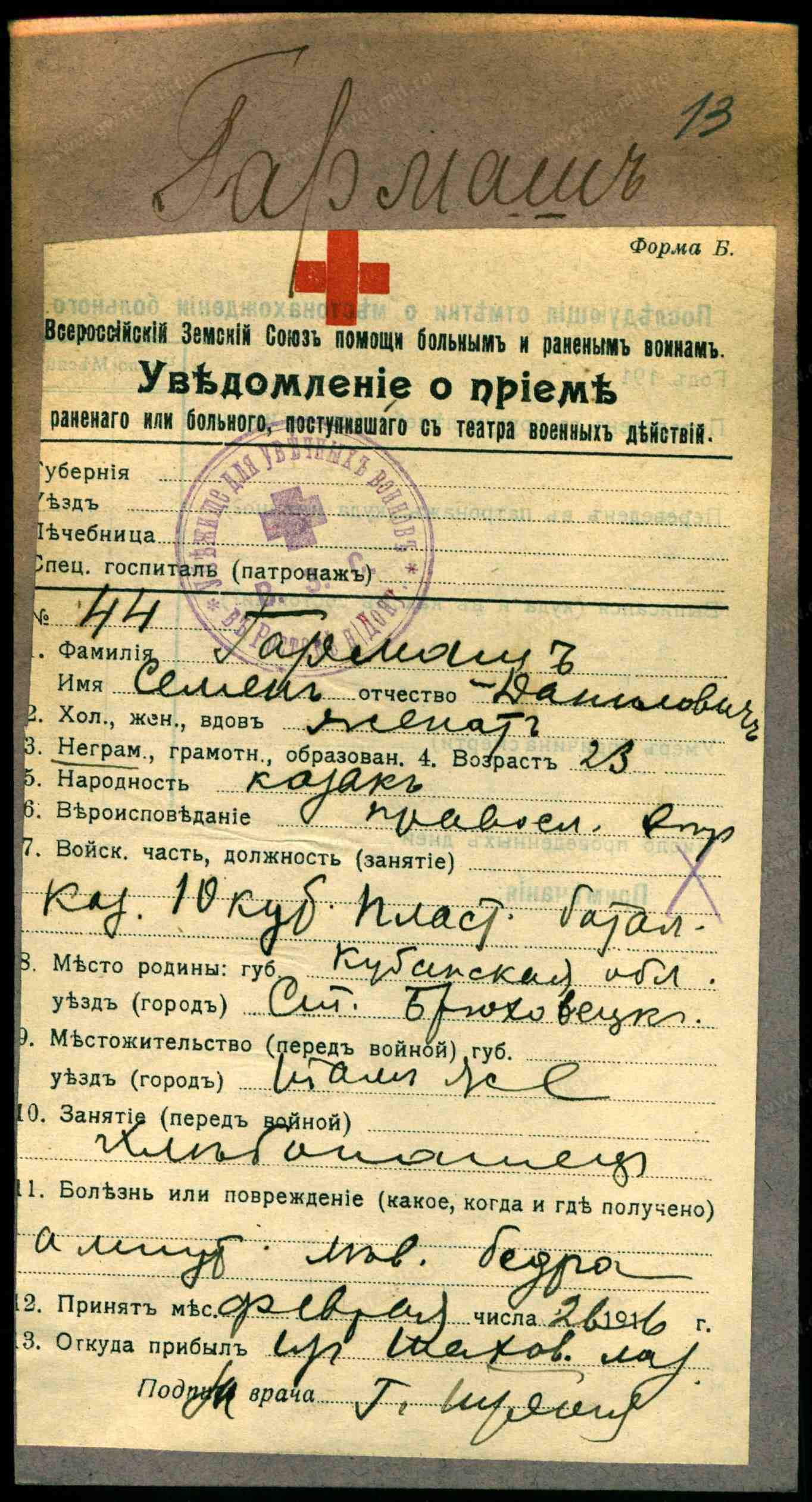 Должность/Звание рядовой казак Воинская часть 4-й Кубанский пластунский батальон Место рождения Кубанская обл., Кавказский отдел, ст. Брюховецкая Причина выбытия болен Дата события 03.06.1915 Тип документа Уведомление о приеме раненого