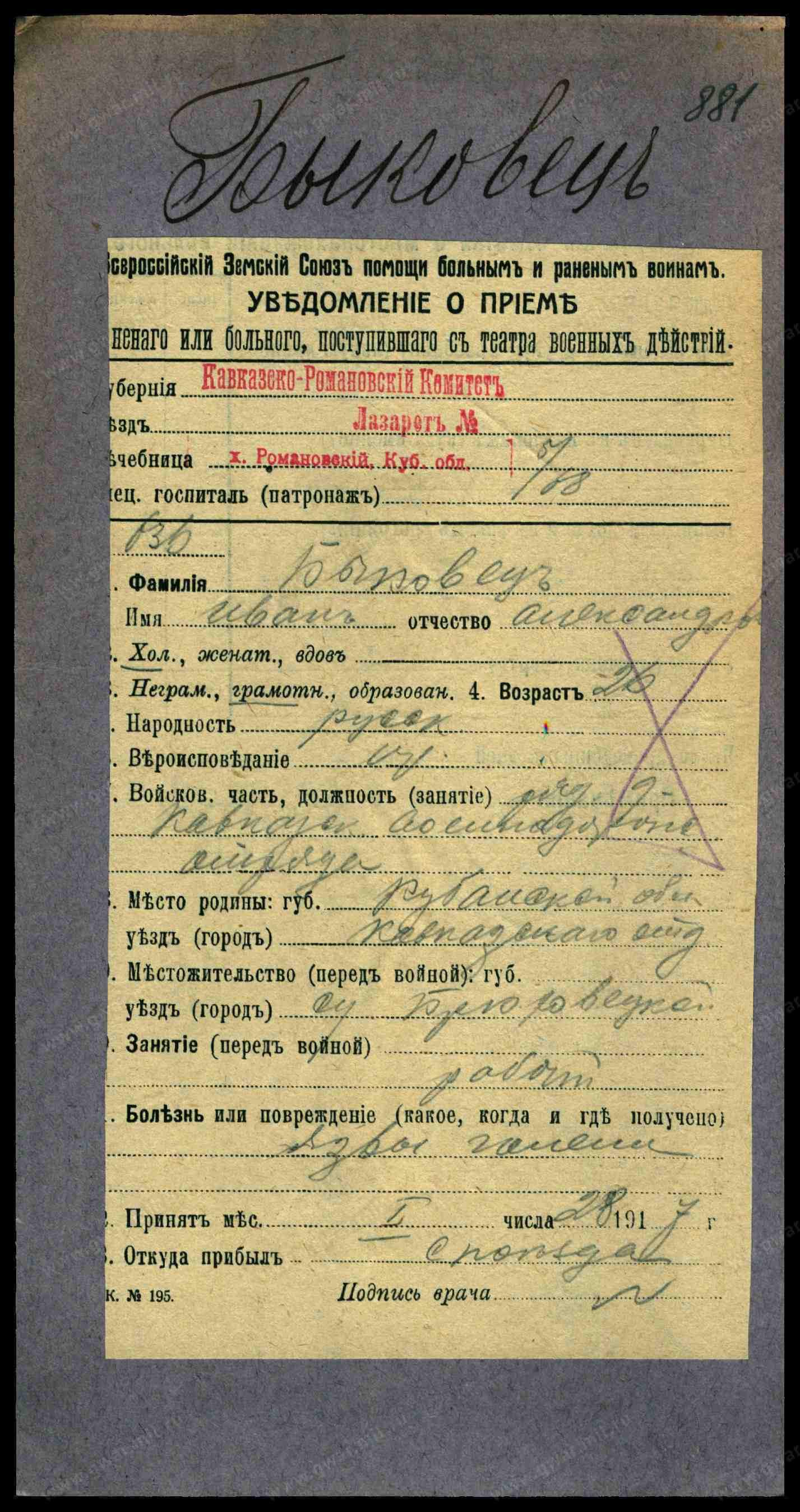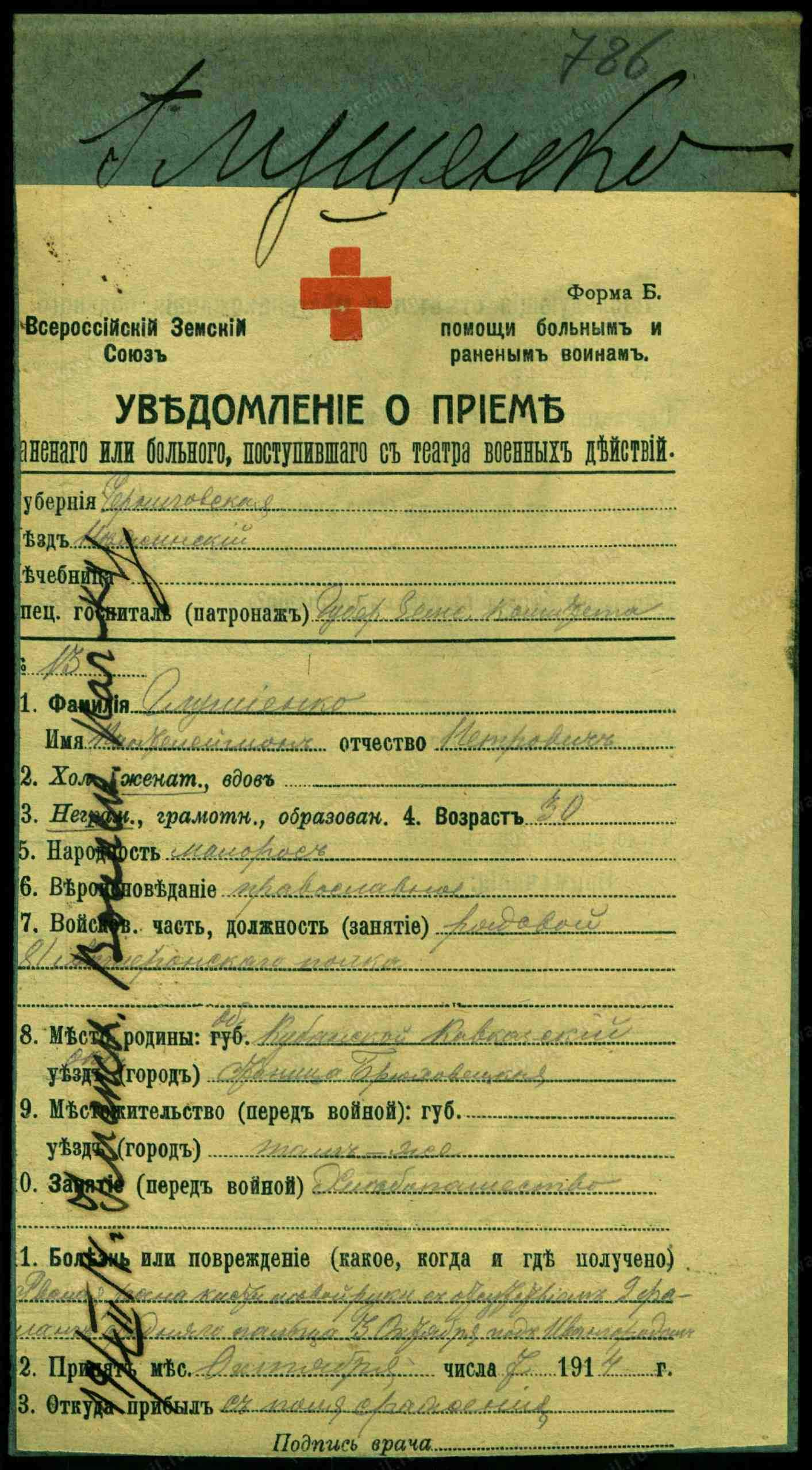 Должность/Звание рядовой Воинская часть 19-й Туркестанский стрелковый полк Место рождения Кубанская обл., Кавказский отдел, д. Брековецкая Причина выбытия болен Дата события 19.04.1917 Тип документа Уведомление о приеме раненого