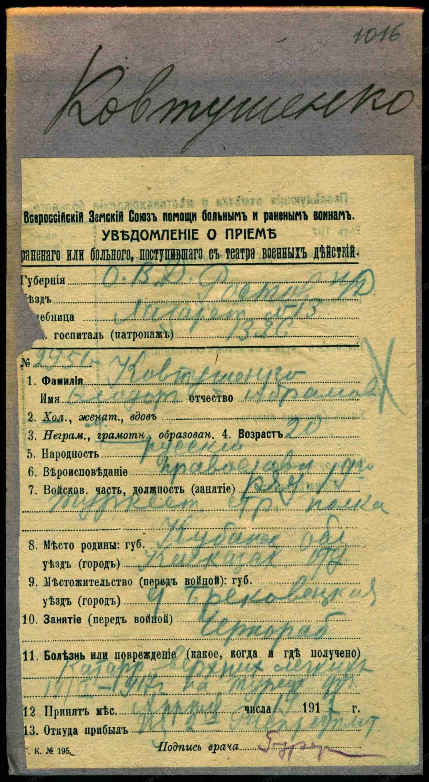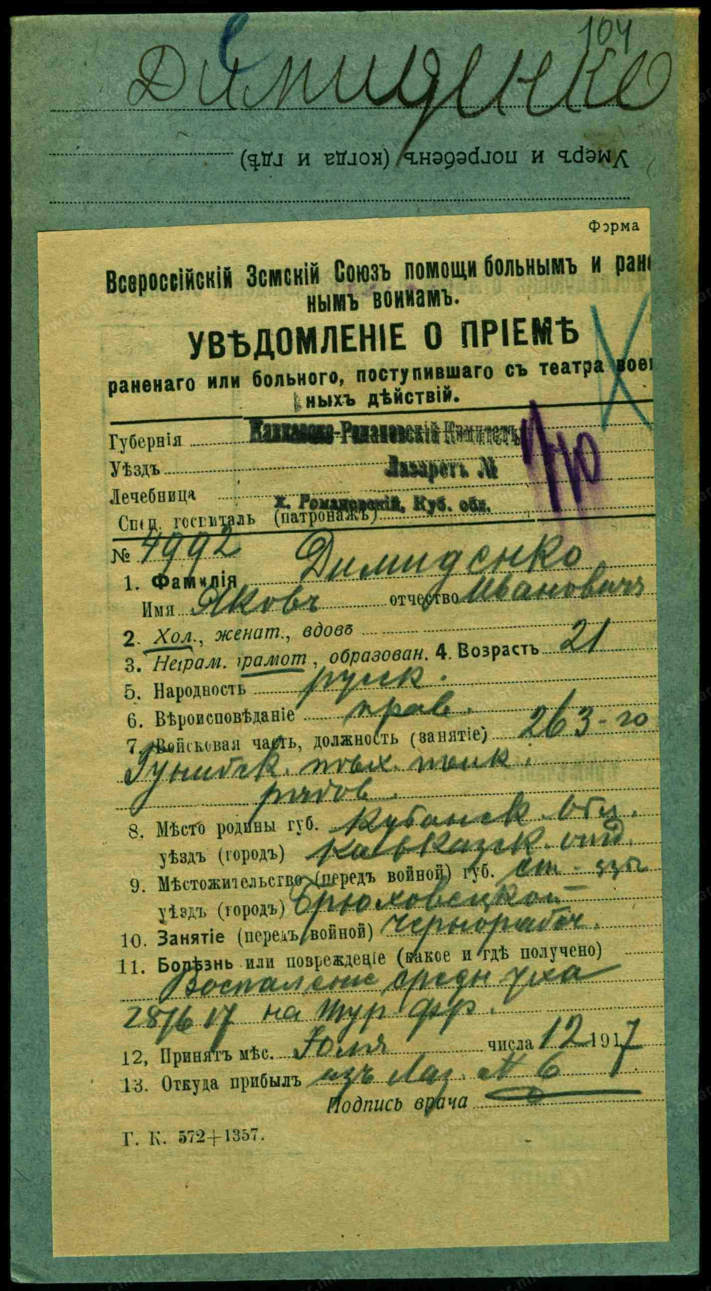 Должность/Звание рядовой Воинская часть 263-й пехотный Гунибский полк Место рождения. Губерния Кубанская обл. Место рождения. Уезд Кавказский отдел Место рождения. Волость Брюховецкая станица Причина выбытия болен Дата события 12.07.1917 Тип документа Уведомление о приеме раненого