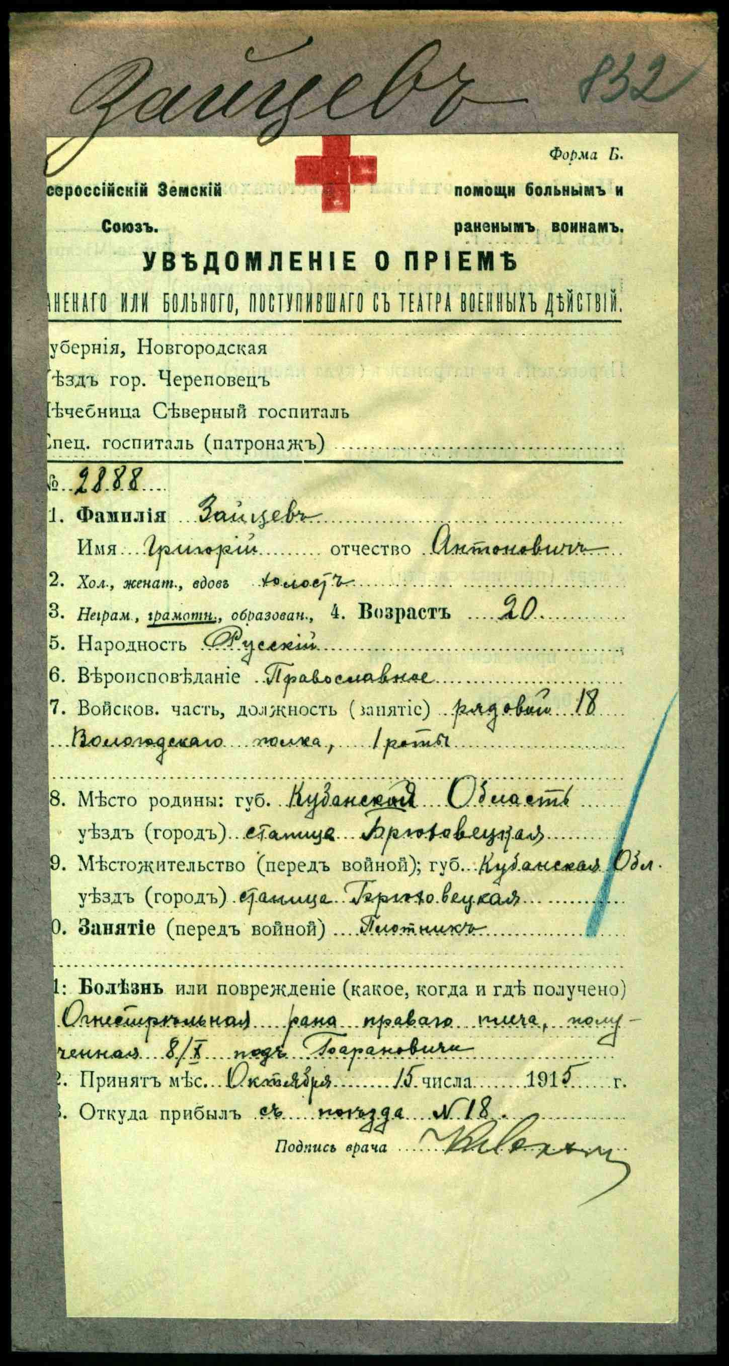 Должность/Звание ст. унтер-офицер Воинская часть 80-й пехотный Кабардинский полк Место рождения Кубанская обл., Кавказский отдел, ст. Брюховецкая Причина выбытия ранен/контужен Дата выбытия 22.05.1915 Дата события 03.06.1915 Место события г. Ярослав Тип документа Уведомление о приеме раненого