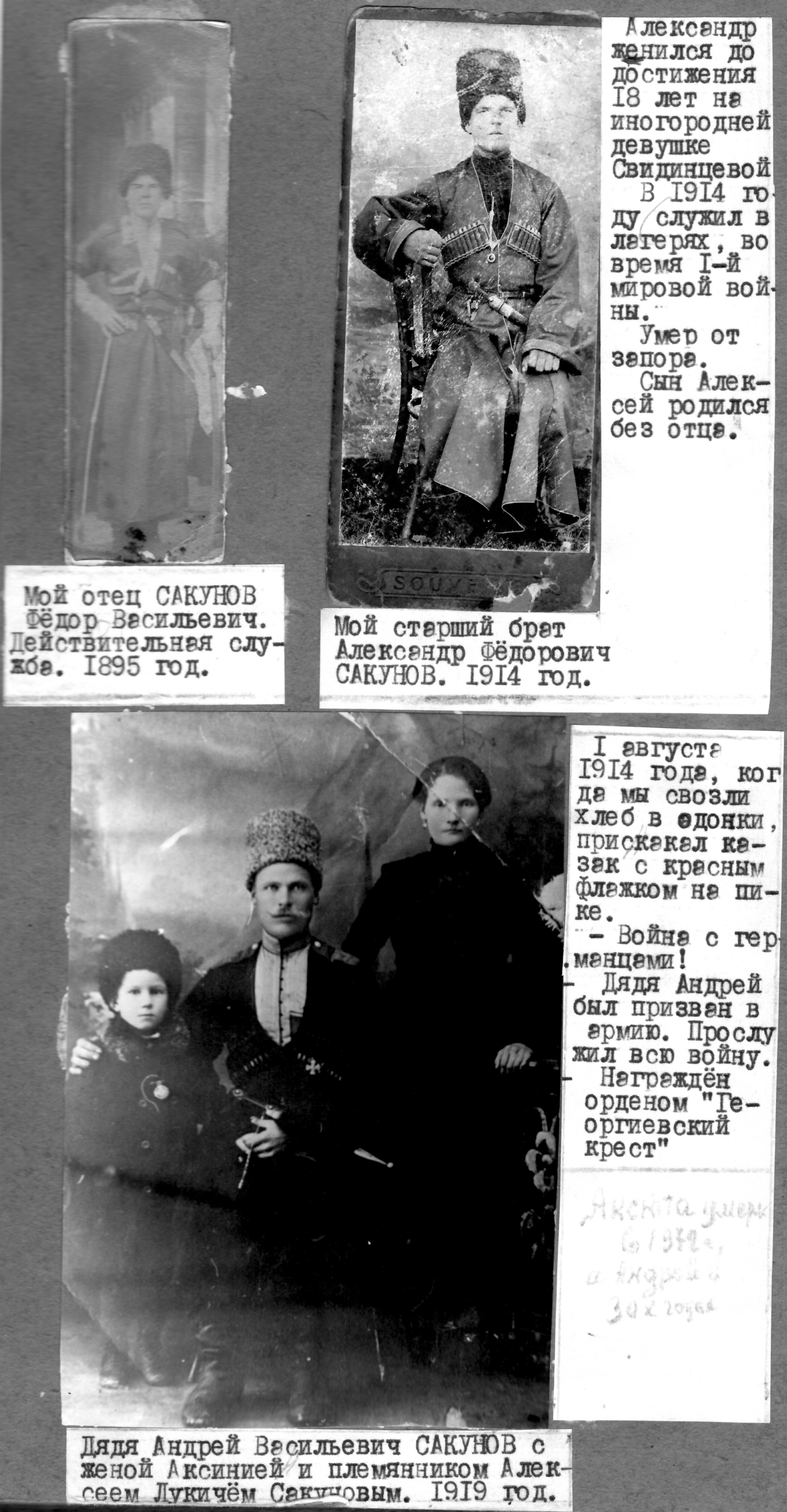Это прадедушка по прямой мужской линии, а Сакунов Андрей мой двоюродный прадедушка, прошел всю Первую мировую, награжден Георгивским крестом, участник Ледового похода, у мер в эмиграции, странно что нет записи про еще одного прадедешку Луку. Я до сих пор не могу понять прапра- Сакун, пра- Сакуновы, а потом снова наша семья стала Сакун.