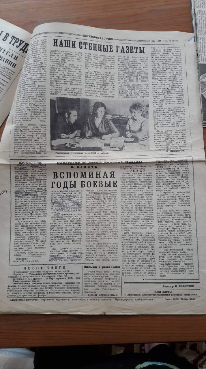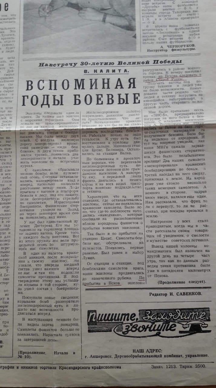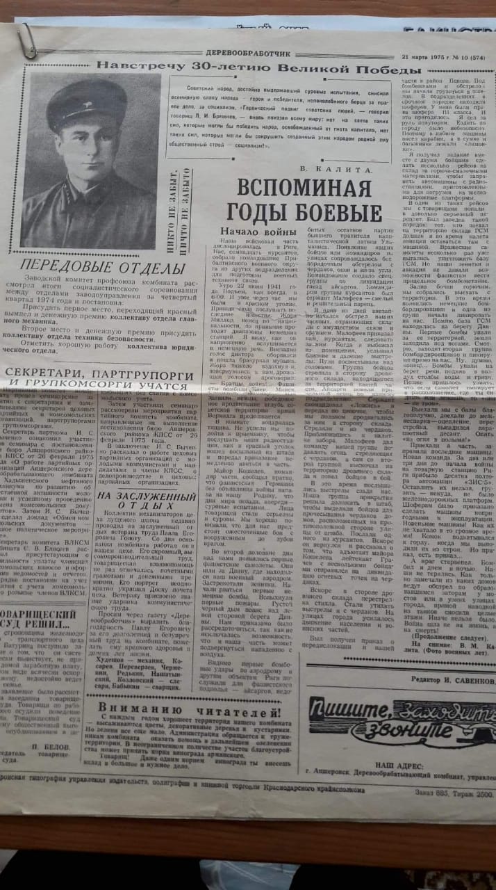 Воспоминания Владимира Михайловича Калита о Великой Отечественной Войне на страницах газеты "Деревообработчик" ПДО Апшеронск